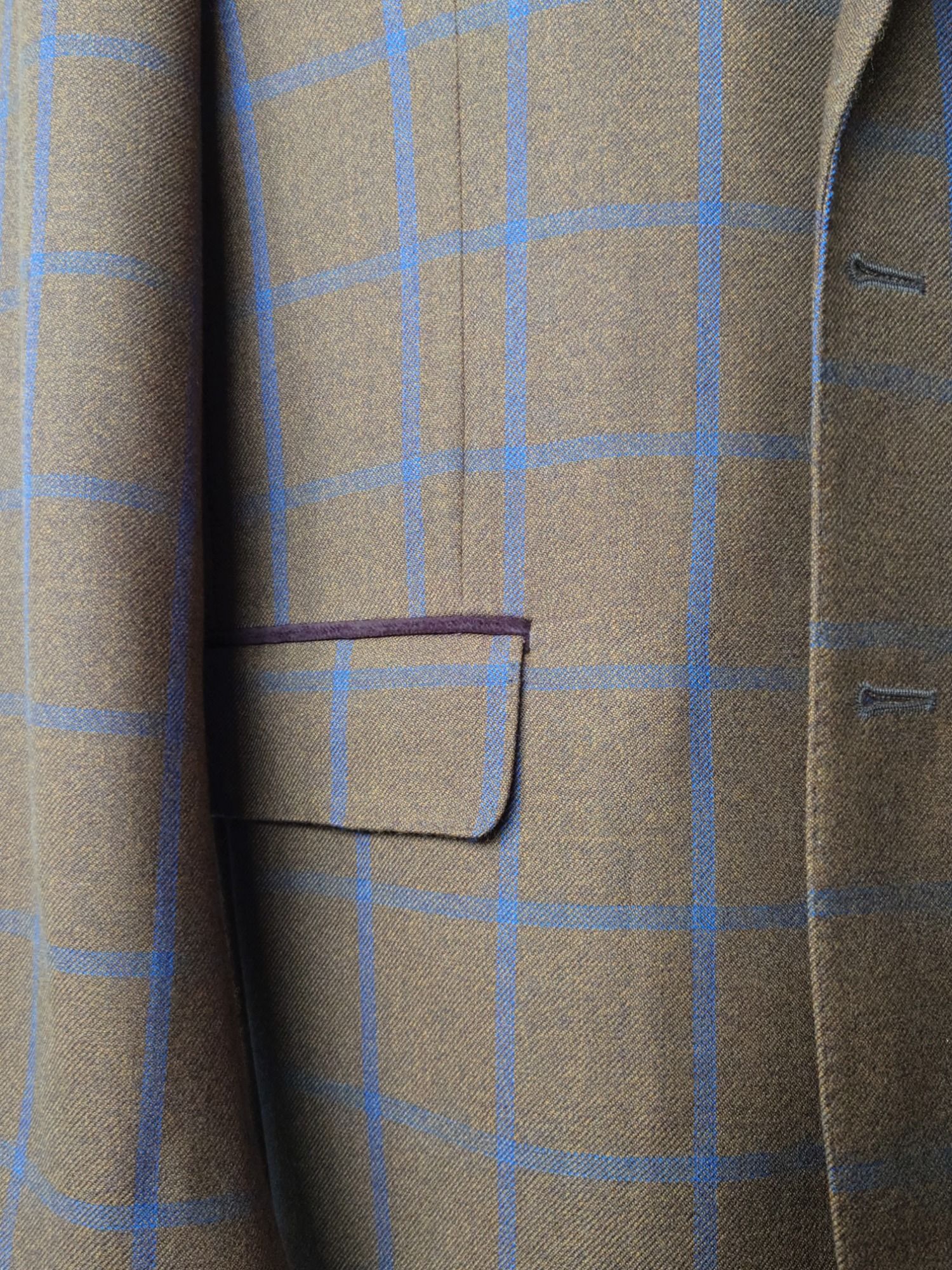 Bespoke Jacket, Scabal blue check with luxury fine art silk lining cloth from Scabal and Rampley and co