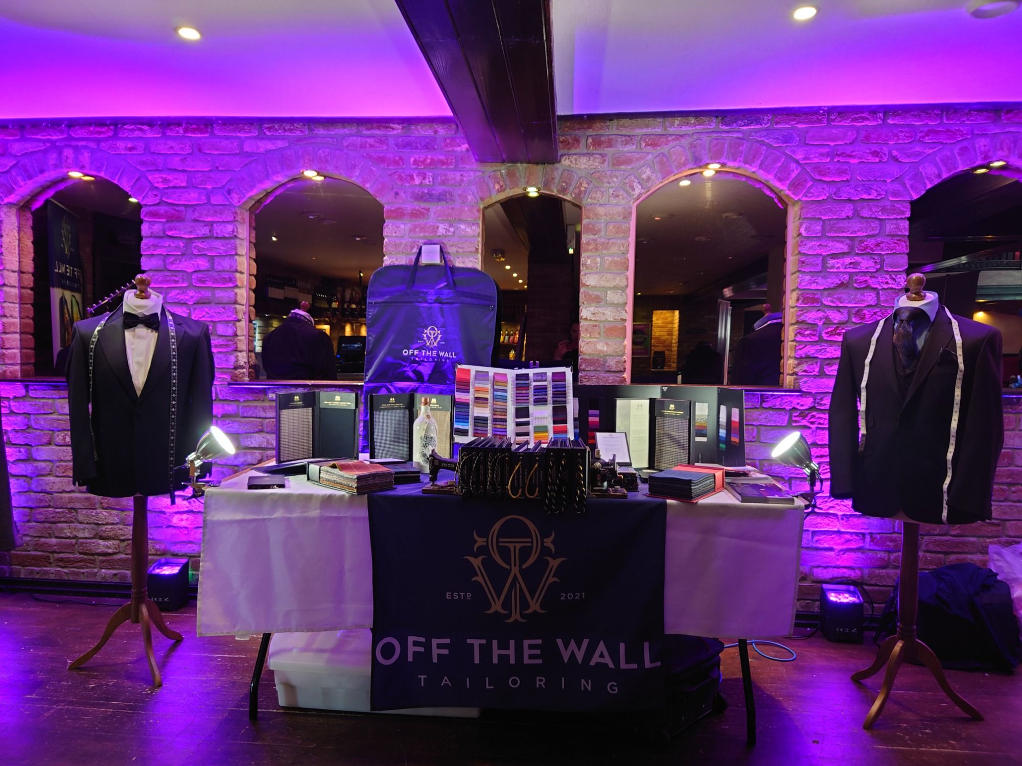 Plain sharkskin Grey suit with blue and light blue elephant lining showing Company Logo Off The Wall Tailoring.