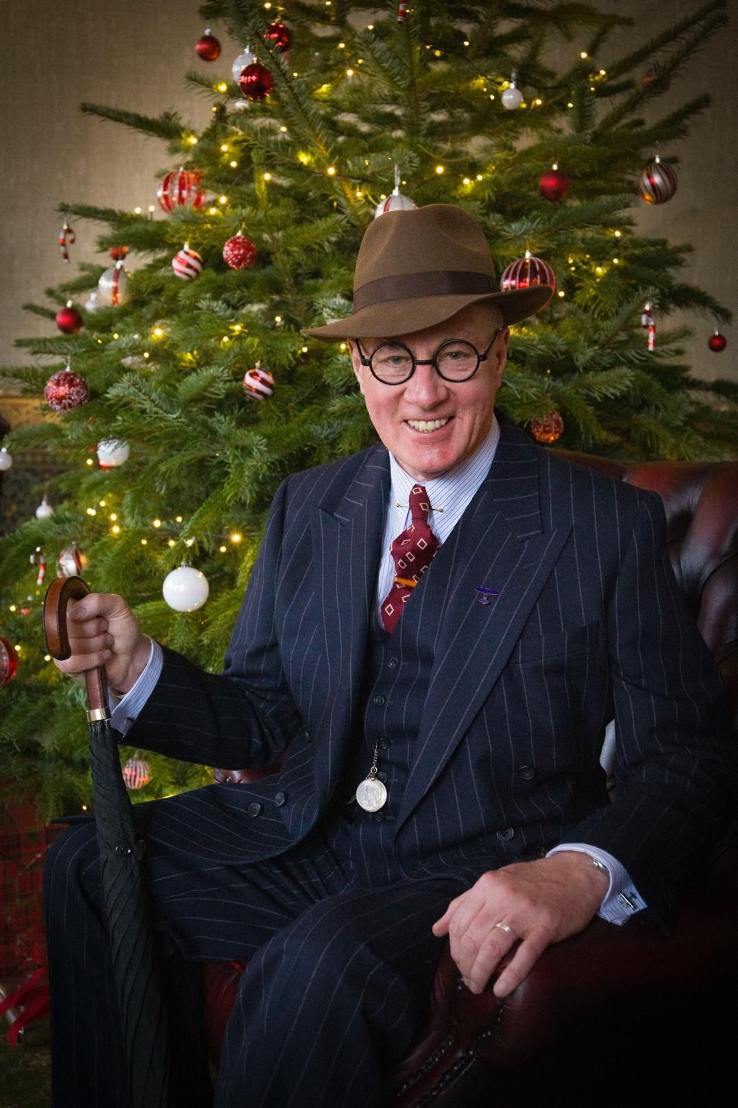 A navy pinstripe double breasted suit (demob) in front of Christmas tree